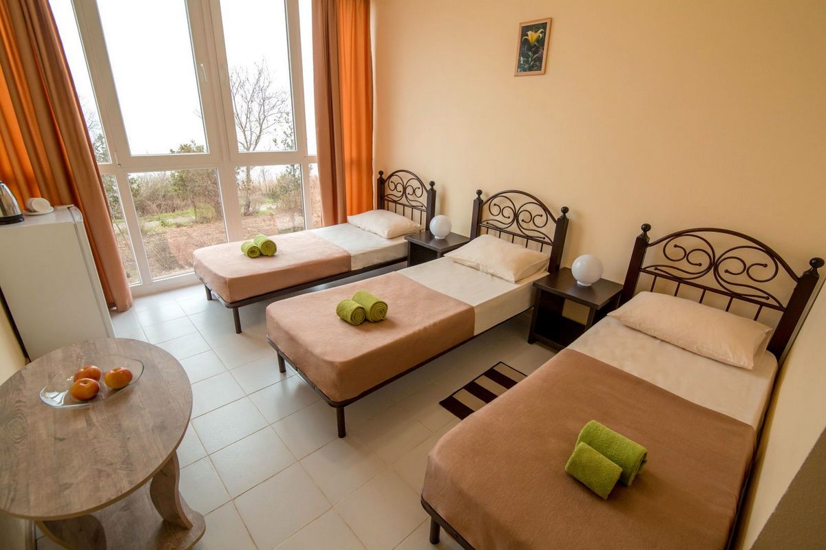 В номере: двуспальная кровать и одна односпальная либо три односпальные кровати, прикроватные тумбы, стол, шкаф для одежды, кондиционер, ЖК телевизор, Wi-Fi, холодильник, электрочайник